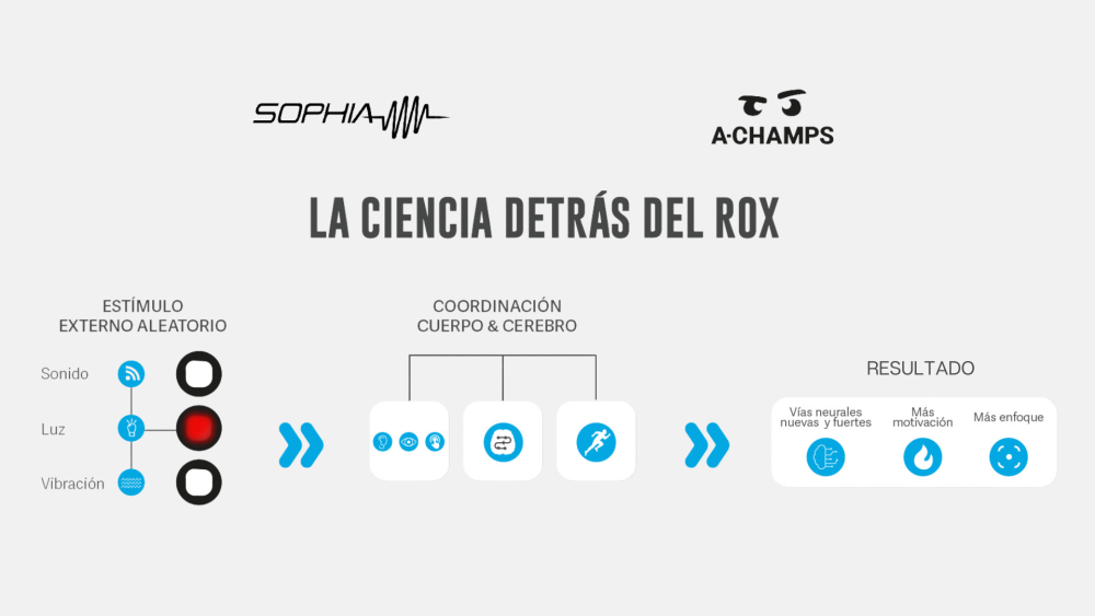 Los dispositivos ROX tienen un sensor que emite una señal aleatoria (llamada "estimulación externa") en forma de luz intermitente, sonido o vibración. El atleta tiene que PERCIBIR la señal a través de sus ojos (parpadeo), oídos (sonido) o piel (vibración). Una vez que el cerebro percibe la información, tiene que PROCESAR la información, por ejemplo, una luz verde representa un movimiento hacia el lado izquierdo y una luz roja significa un movimiento hacia el lado derecho. En este escenario, el cerebro ahora ha recibido la información de que una luz roja está parpadeando, el cerebro procesa la información y toma la decisión de que es necesario un movimiento del lado derecho. Luego, el cerebro envía una orden a los grupos musculares relevantes para que REACCIONEN con un movimiento que va hacia el lado derecho.